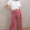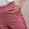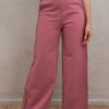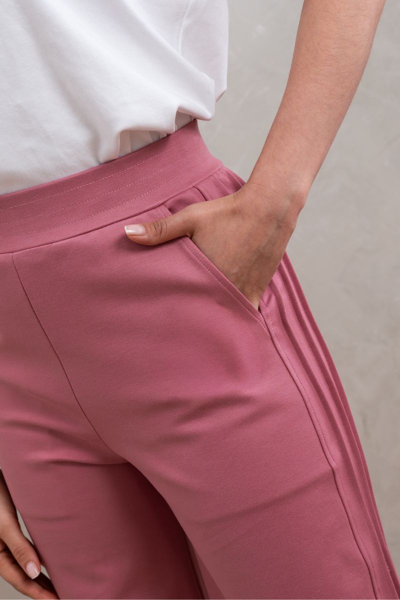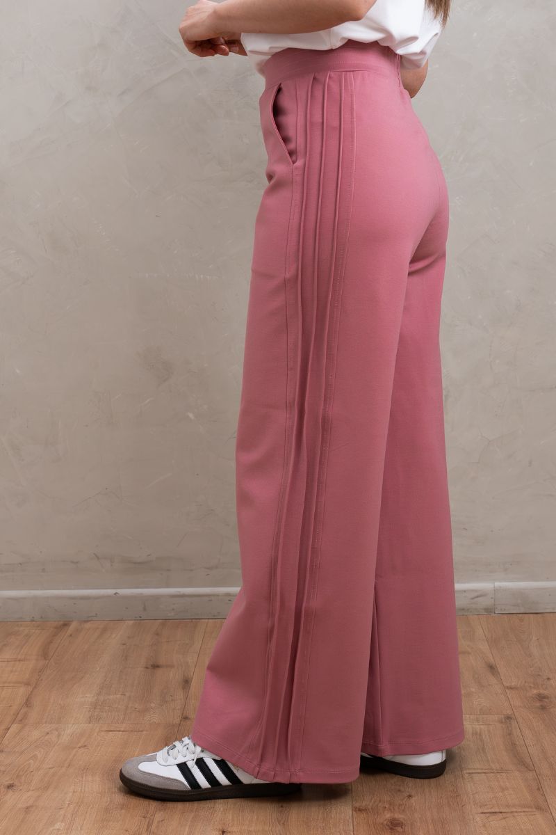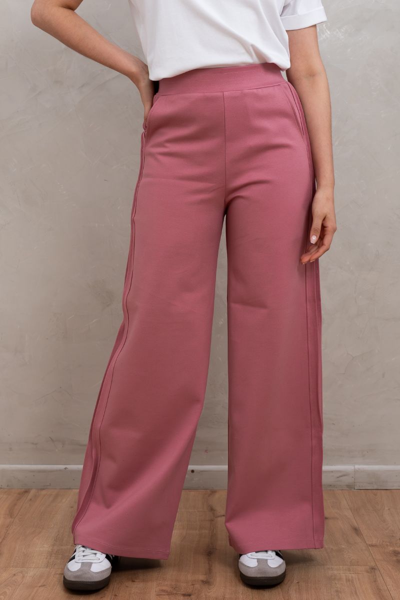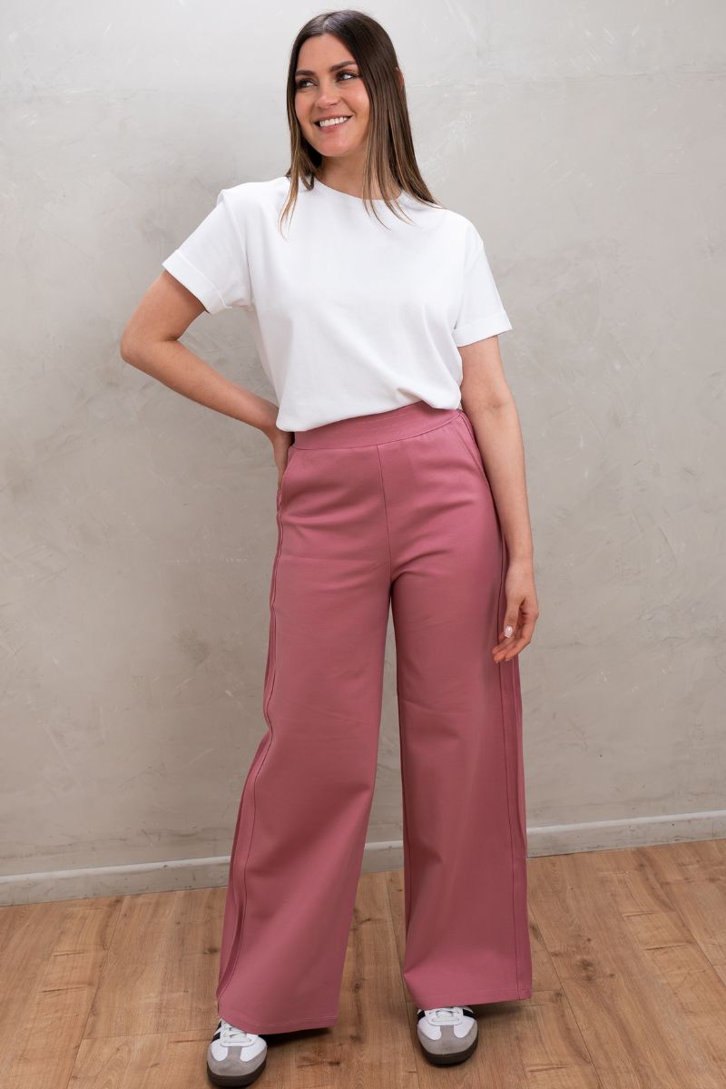 Pantalón de corte pierna ancha, con bolsillos delanteros y aplicaciones laterales. Hecho en Loma de 400 grms (67% algodón Viscosa, 30% Poliester, 3% Elastano)