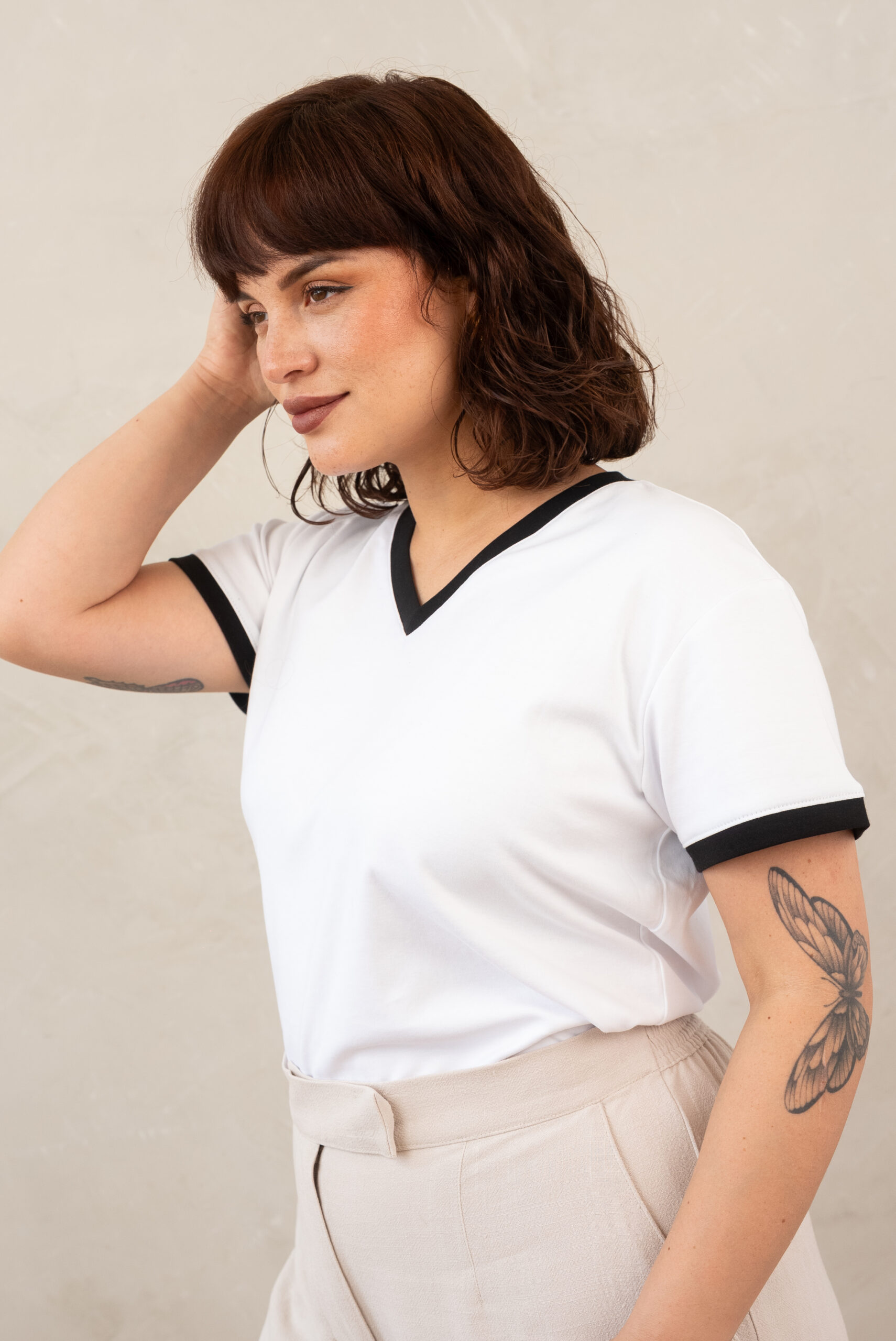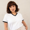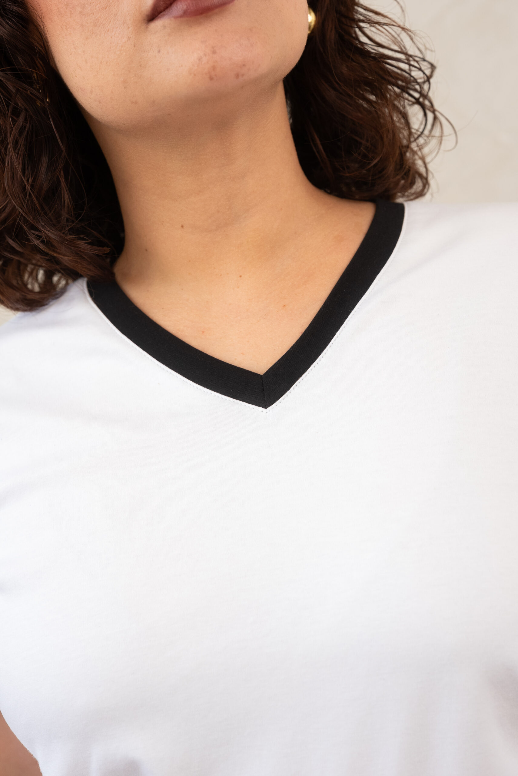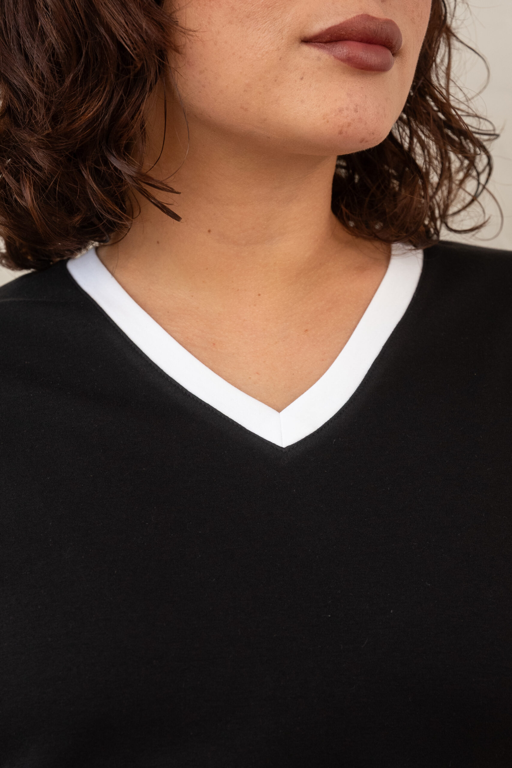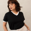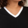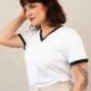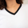 - Fit holgado y cuello V con filos en contraste bicolor en cuello y mangas.