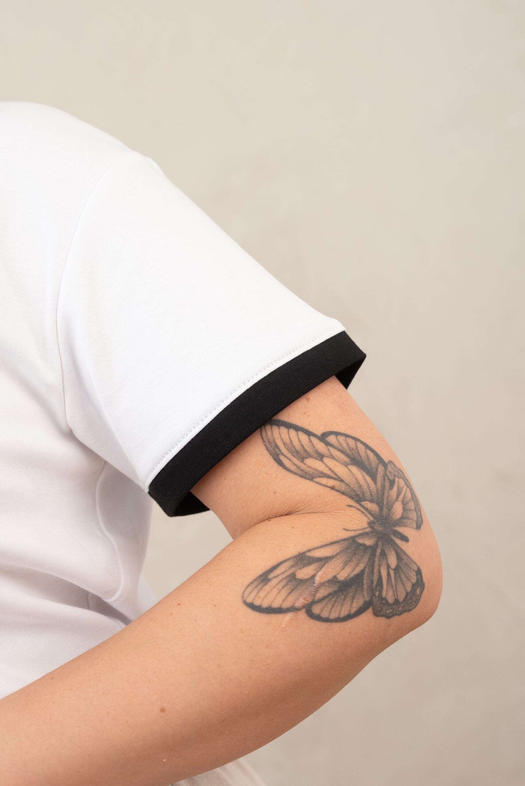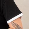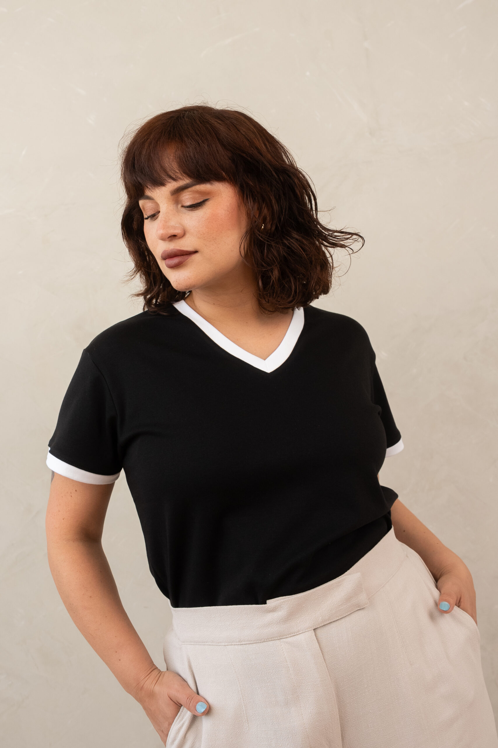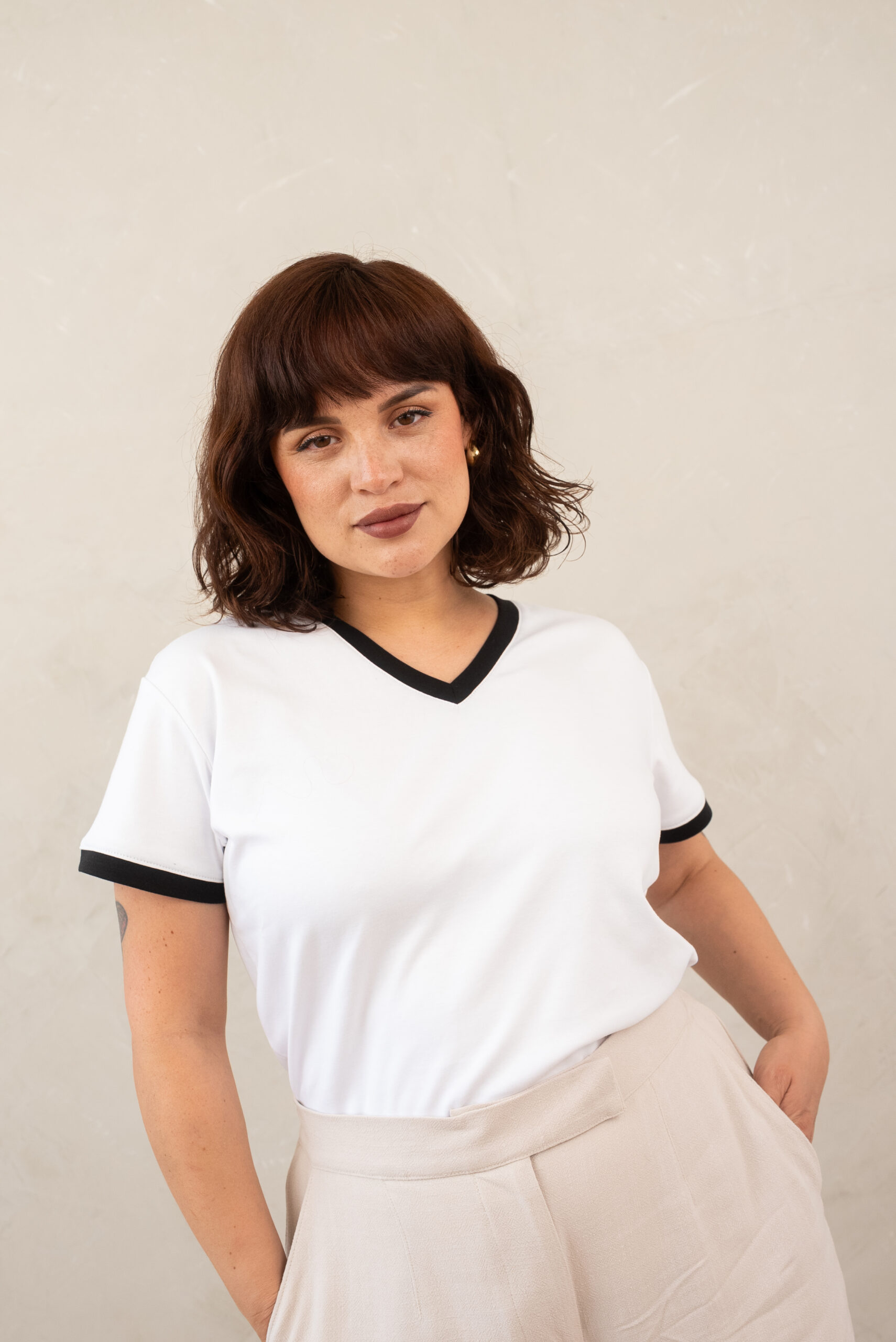 - Fit holgado y cuello V con filos en contraste bicolor en cuello y mangas.